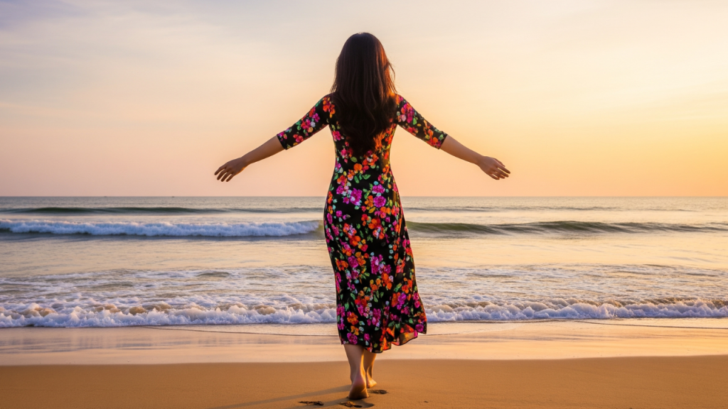 Cô cởi dép, để đôi chân trần lần đầu tiên cảm nhận sự mềm mại, mịn màng của bãi cát. Cát len vào kẽ chân, ấm áp và dễ chịu. Cô bước đi, lúc đầu còn hơi ngập ngừng, nhưng rồi ngày càng tự tin hơn. Cô đi về phía mép nước, để những con sóng bạc đầu xô vào chân mình, gột rửa đi những dấu chân trên cát, và dường như cũng gột rửa đi cả những mặc cảm cuối cùng trong lòng cô.