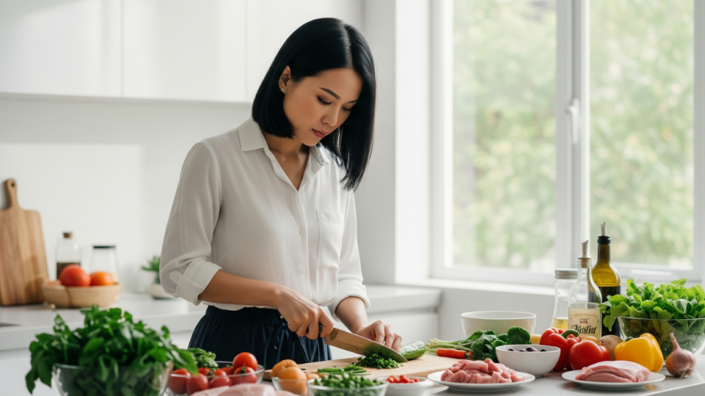 Lần đầu tiên trong đời, Minh Anh bước vào siêu thị không phải để tìm đến gian hàng bánh kẹo hay nước ngọt. Cô đẩy chiếc xe đi qua những quầy rau củ xanh mướt, những miếng ức gà tươi ngon, những loại cá giàu omega-3. Cô học cách đọc nhãn mác sản phẩm, nhận ra lượng đường và chất béo ẩn giấu trong những món ăn mà cô từng vô tư nạp vào người. Căn bếp, nơi từng chỉ dùng để đun nước pha mì tôm hay chiên lại đồ ăn sẵn, giờ đây trở thành phòng thí nghiệm của cô.